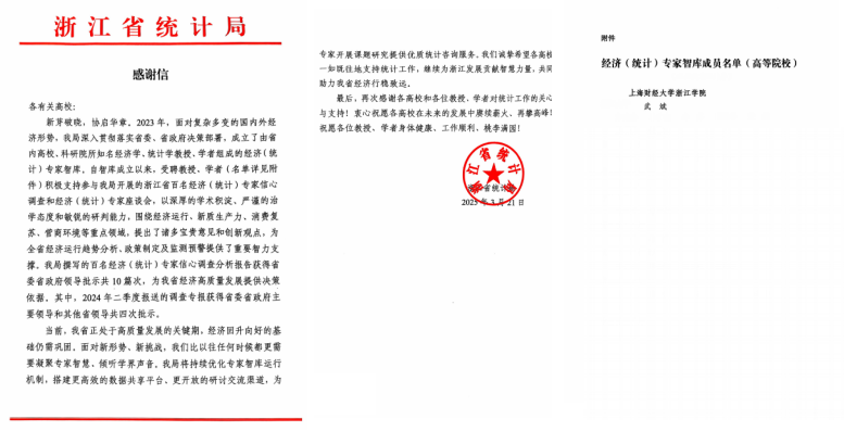 近日,我院收到来自浙江省统计局的感谢信,信中对我院武斌同志在经济(统计)专家智库工作中做出的贡献表示感谢。
